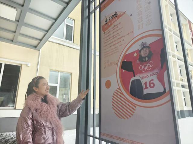 何玲在吉林市松江东路小学校(原吉林市万达实验小学校)文化长廊介绍苏翊鸣展示板。新华社记者 周万鹏 摄